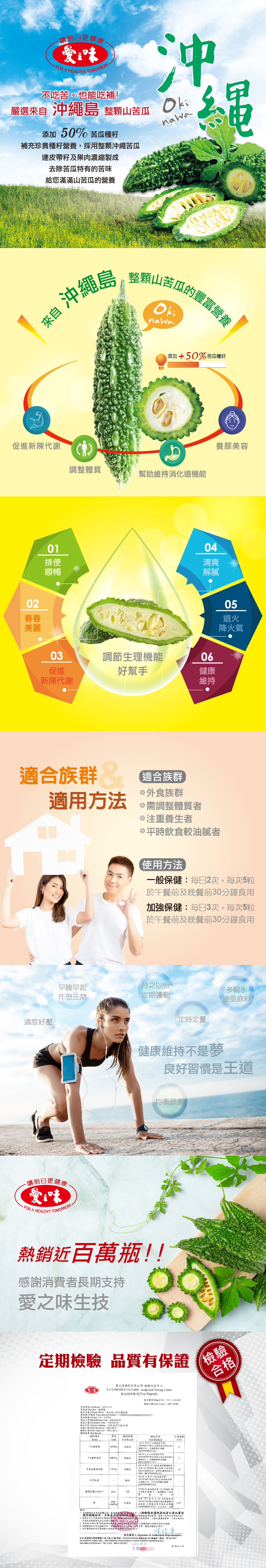 採用整顆沖繩苦瓜,連皮帶籽及果肉濃縮製成,去除苦瓜特有的苦味,保留重要保健成分。